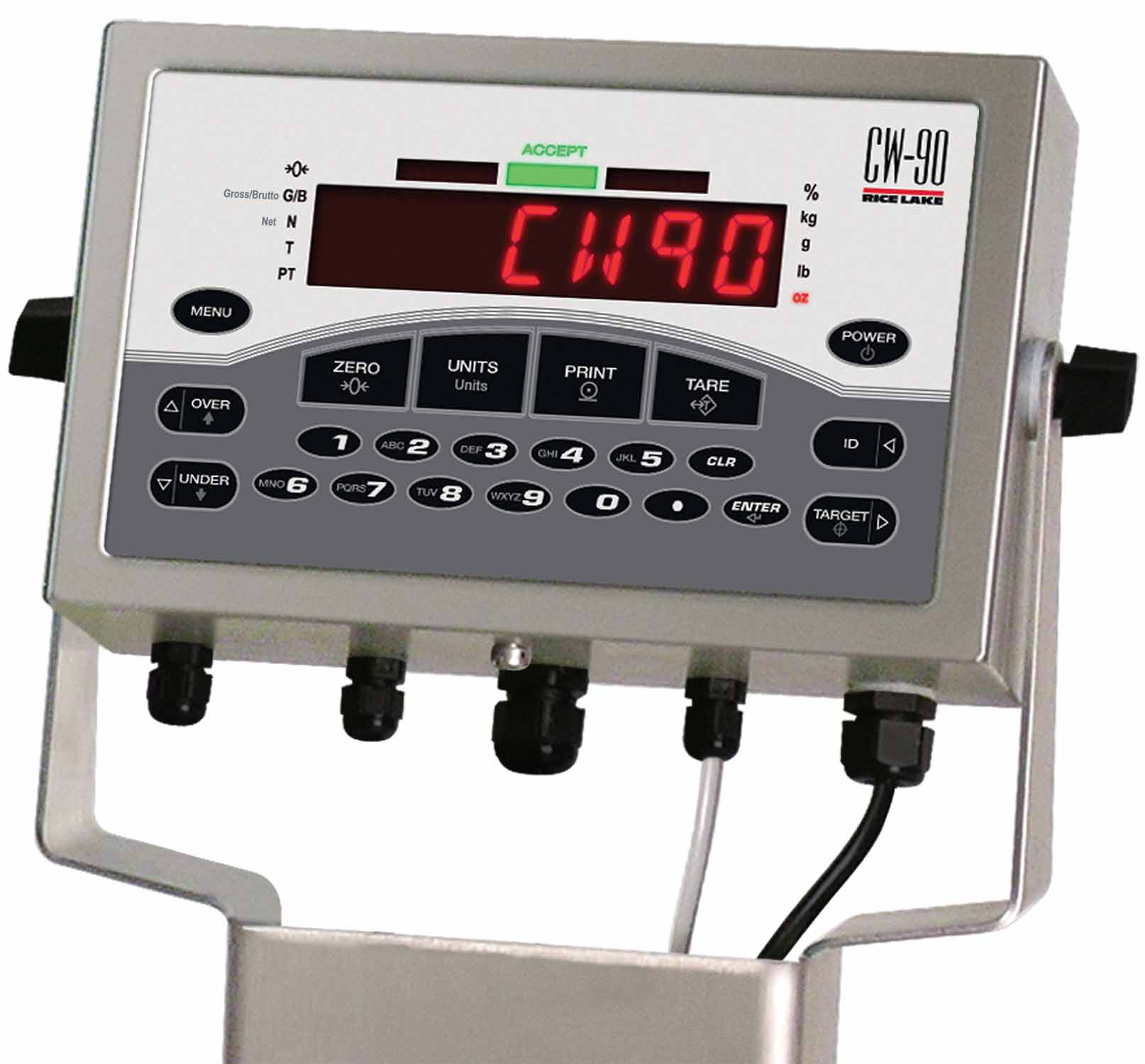- Membrane keypad consisting of zero, units, print, tare, over, under, ID, target, 0-9, clear, decimal, enter, menu, power